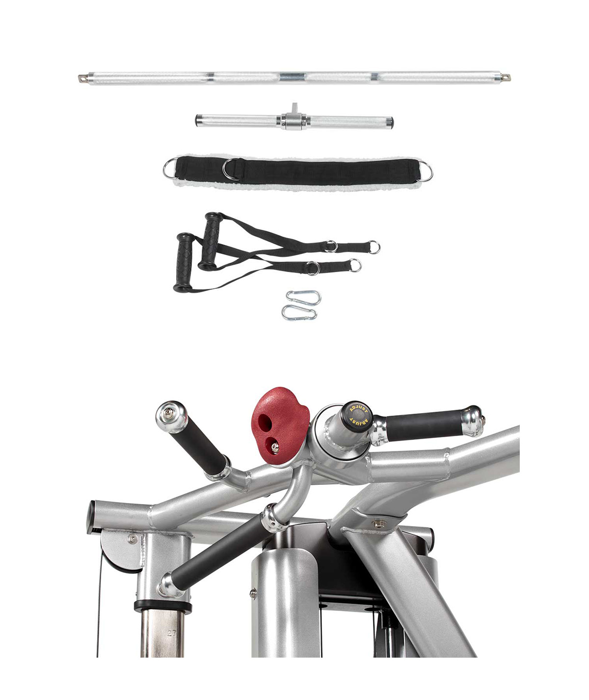 - 空间高效的功能性训练器,采用便捷的角落设计和配件机架。